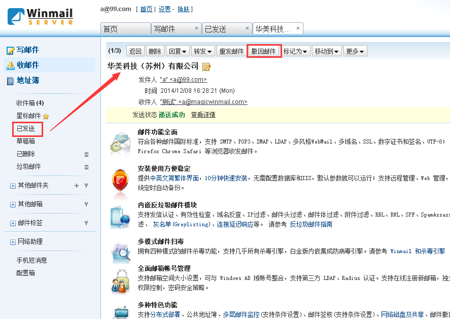 2. 邮件发给 Winmail 内部用户或者外部的 Winmail 服务器。因为没有统一的协议规则,发到其他系统的邮件无法撤回。