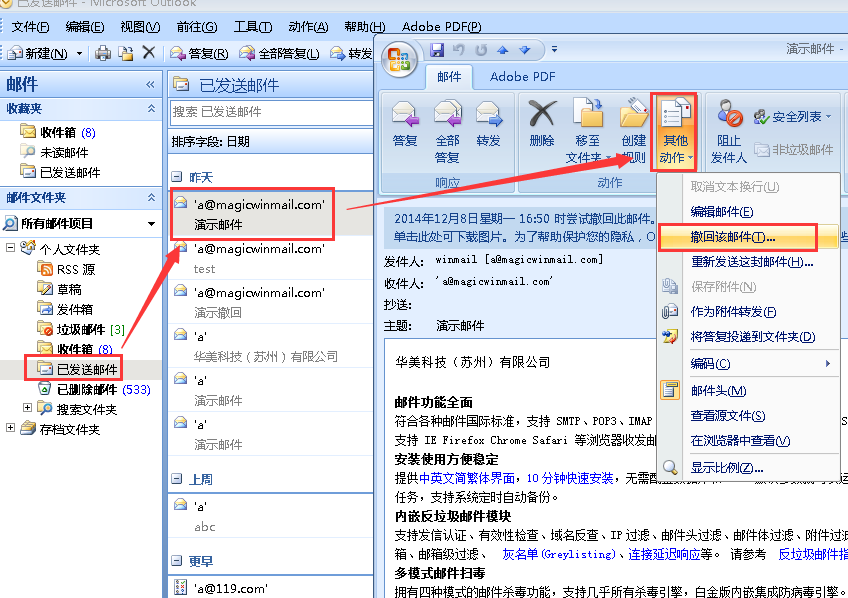 当用户发送邮件后,发现已发出的邮件内容有问题,想把已发送的邮件撤回,不让收件人看到此邮件,此时我们可以使用 Winmail 的邮件撤回功能。