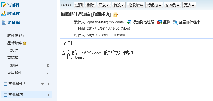 撤回邮件结果:系统发邮件告知撤回邮件操作是否成功。